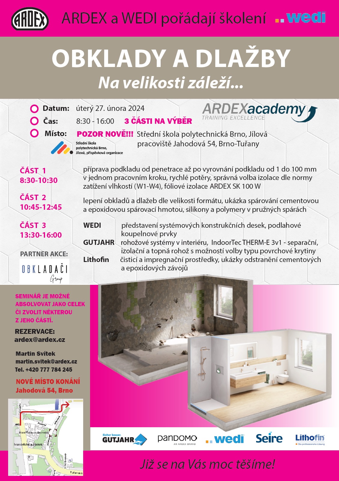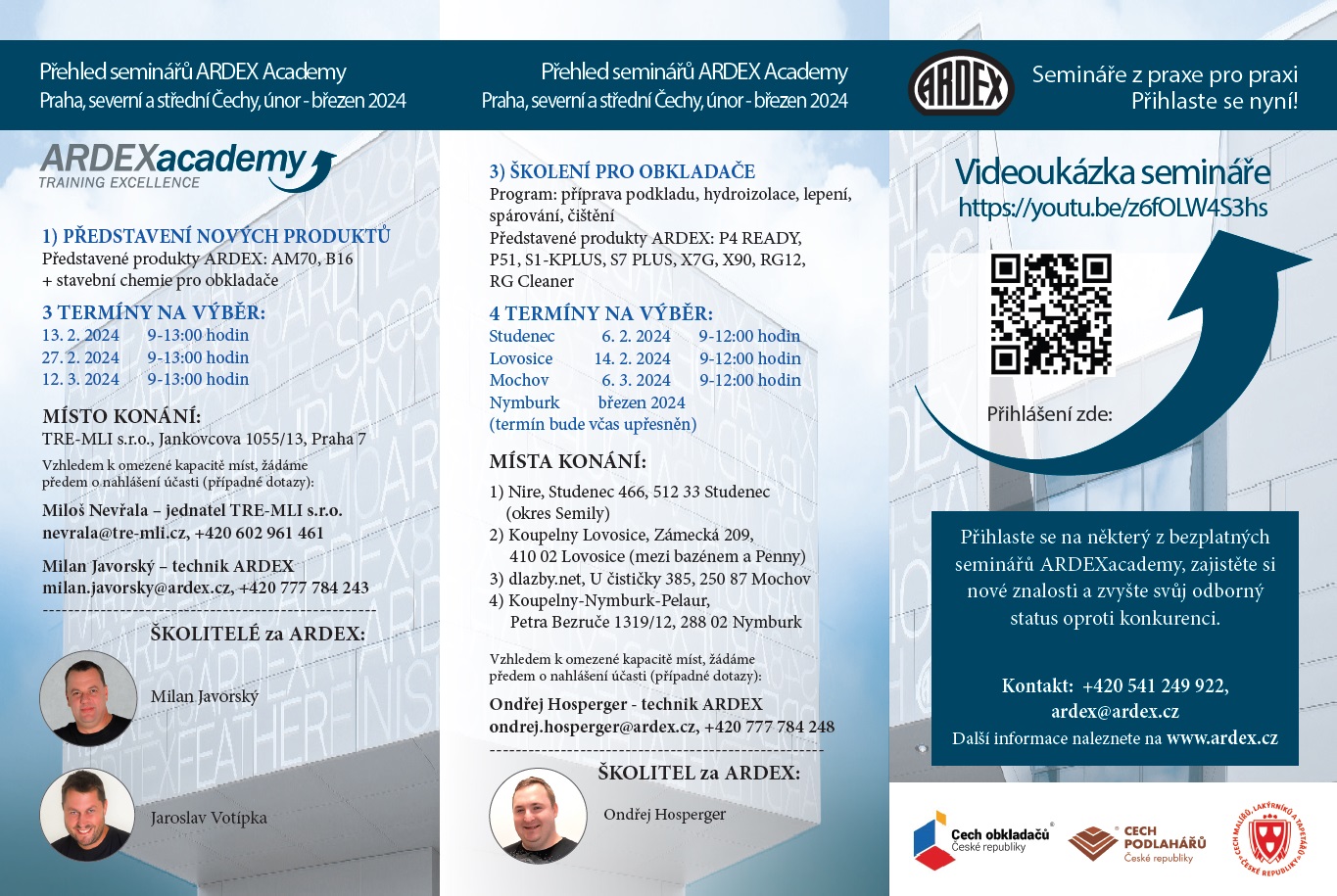 ARDEXacademy Vás zve na sadu školení ve spolupráci s Cech obkladačů ČR a dalšími subjekty. Více informací v jednotlivých pozvánkách.
