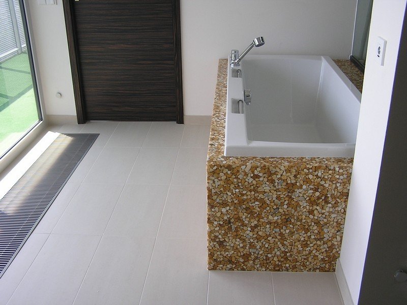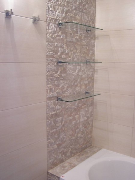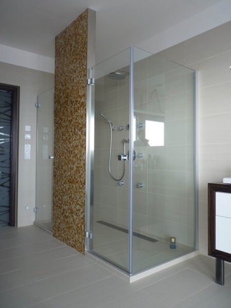Jako jedna z mála firem jsme schopni kvalitně provést obklady a dlažby ze skleněných materiálů dodávaných firmou Kernel a.s., proto velkou část našich zakázek tvoří luxusně vybavované byty a rodinné domy.