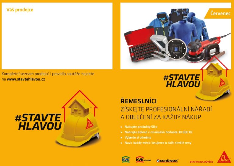 Akce #STAVTEHLAVOU běží do 30. 11. 2019. Nakupujte pravidelně produkty Sika, odměny se každý měsíc mění. Zúčastnit se můžete i vícekrát – v jednom měsíci můžete nahrát až 8 dokladů. Kompletní seznam prodejců i pravidla soutěže najdete na www.stavtehlavou.cz.