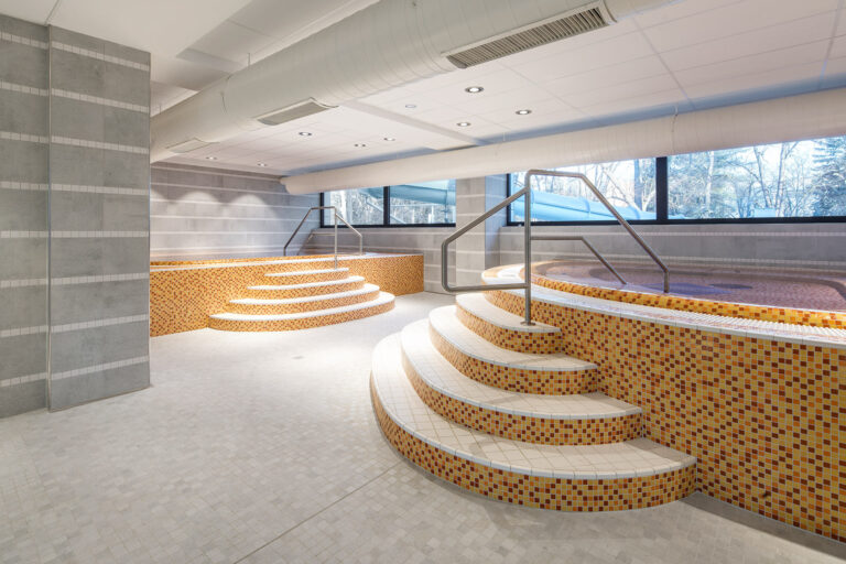 Z hlediska výběru keramických obkladů a dlažeb je bazén koncipován tak, aby kromě atraktivního vzhledu byly povrchy vysoce funkční, tedy dobře čistitelné a hlavně bezpečné. Vysoce slinuté keramické glazované dlaždice RAKO ze série Cemento dodaly podlahám vzhled betonové stěrky. Série nabízí v jednom designu širokou škálu druhů povrchů v různých třídách protiskluznosti (R9, R10 i R11, pro bosou nohu A, B i C), což je její velká výhoda. Na jedné straně to umožňuje plnit dokonale technické normy protiskluznosti i v tak náročném prostředí, jako je veřejný bazén, a na straně druhé nabízí totožný vzhled všech druhů povrchů. Podlaha tak nádherně plyne prostorem, vede vás od vstupní haly, chodbami, sociálním zázemím včetně sprch až do bazénové haly. Povrch dlaždic série Cemento je hladký, protiskluznost tedy zajišťuje výhradně posyp v podobě speciální granílie.