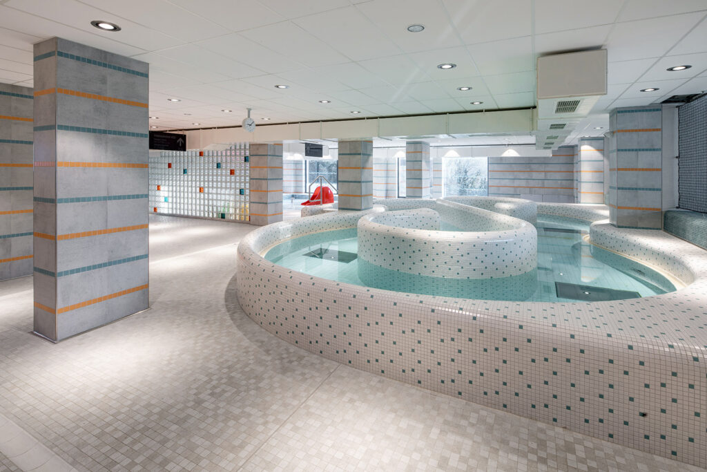Všechny bazénové vany jsou provedeny z dlaždic série ColorTwo formátu 20 x 10 cm, R10/B, především v odstínech tyrkysové (vnitřní bazény) a modré (venkovní bazény). Nášlapy schodů do vody a borty, na kterých stojí skokanské můstky, tvoří hutné dlaždice ColorTwo formátu 10 x 10 cm s protiskluzem C podle platné normy.