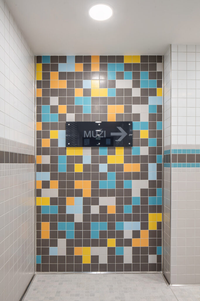 V prostorech u výstupních žebříků nahrazuje velký formát mozaika 5 x 5 cm, rovněž ze série Cemento. Jde o funkční prvek zohledňující velké množství vody, které při opouštění bazénu stéká na podlahu a může snížit protiskluz. Mozaika má oproti velkému formátu vysoký podíl spár, které pomáhají vodě odtéct. Volba mozaiky je tak dalším krokem k vyšší bezpečnosti návštěvníků, kteří se tu mohou cítit komfortně. Ze stejného důvodu byly mozaiky navrženy také pro podlahy ve sprchách a v okolí vodních atrakcí.