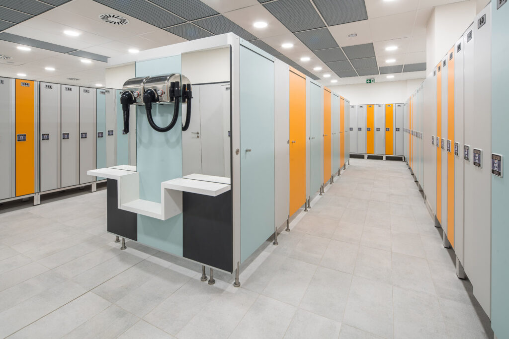 Obklady stěn ve sprchách a dalších řešených prostorech tvoří glazované hutné dlaždice ze série ColorTwo. Zvolená minimální otěruvzdornost PEI 3 znamená, že povrch odolá bez problémů i silnému chemickému čištění. Stěny a většinu sloupů v bazénové hale pokryly dlaždice série Cemento s barevnými akcenty tvořenými mozaikou 5 x 5 cm ze série ColorTwo. Zajímavostí pokládky je různá tloušťka zvolených materiálů (Cemento 10 mm, ColorTwo 7 mm), vyžadující znalost i precizní práci při provádění ze strany obkladačů.