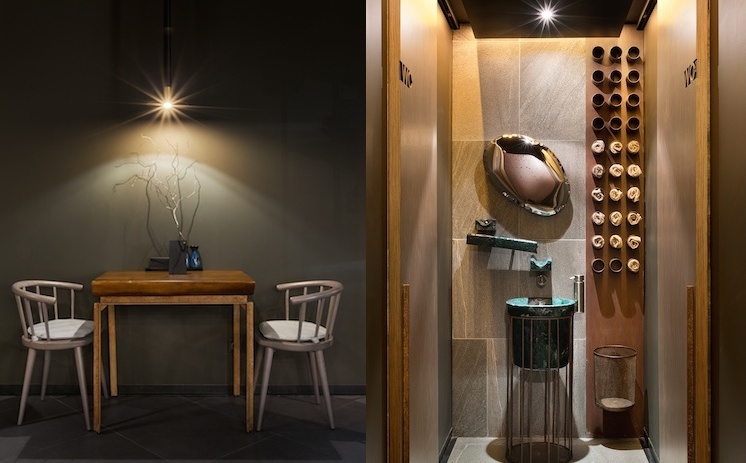 Celý interiér je založen na několika jasných detailech, jako jsou desky stolů z masivního materiálu z palmového dubu. Strom sám o sobě je tak jedinečný a originální, že to byl ve skutečnosti hlavní důvod, proč zvolit tak striktní a diskrétní formát designu. Při práci s omezeným počtem materiálů využívali designéři kontrast a hmatové vjemy. I proto se na stropě objevila jedinečná plstěná svítidla v individuálních provedeních, která kontrastují s přírodním rezavým obložením. Svítidla vypadají jako kameny, avšak na dotek jsou měkká a příjemná. Udusanou hlínu na podlaze připomínají velkoformátové dlaždice ze série Clay s jemným matným reliéfem, které si designéři vybrali u české značky RAKO.