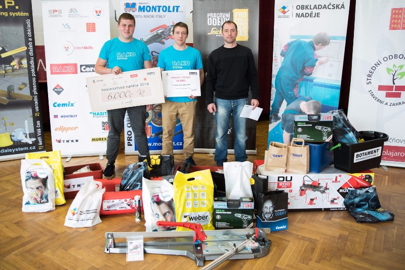 Pro samotné obkladače byla motivací nejen finanční odměna (1. místo 6 000 Kč/dvojice, 2.místo 4 000 Kč/dvojice a 3. místo 2 000 Kč/dvojice) ale i akumulátorové nářadí, ruční nářadí, oblečení, pomůcky pro obkladačskou práci a zásluhou štědrosti partnerů toho bylo tolik, že je vítězové nedokázali ani najednou pobrat. A za takovou podporu patří velké poděkování těmto firmám a značkám: Rubi, RAKO, Ceresit, Montolit, Bat nářadí, Norton Clipper, Hasit, Weber, Gent, Cemix, Murexin, Baumit, Botament a Snickers.