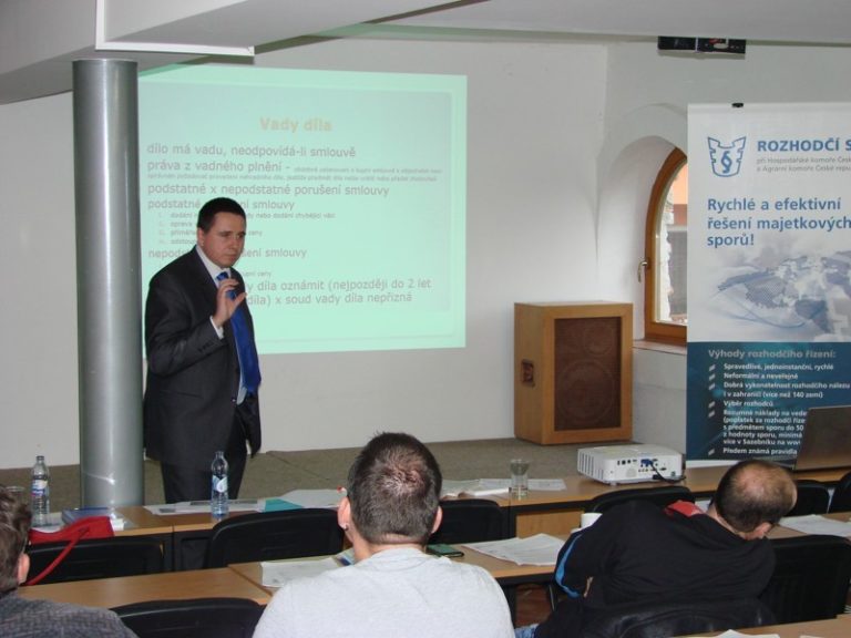 V dopoledním programu se zástupce advokátní kanceláře věnoval závazkovému právu, především smlouvě o dílo.Plynule na to navázal zástupce Rozhodčího soudu při HKČR a AKČR s možnostmi rozhodčí doložky a rozhodčího soudu (obě prezentace jsou umístěny do intranetu webu – informace pro členy).
