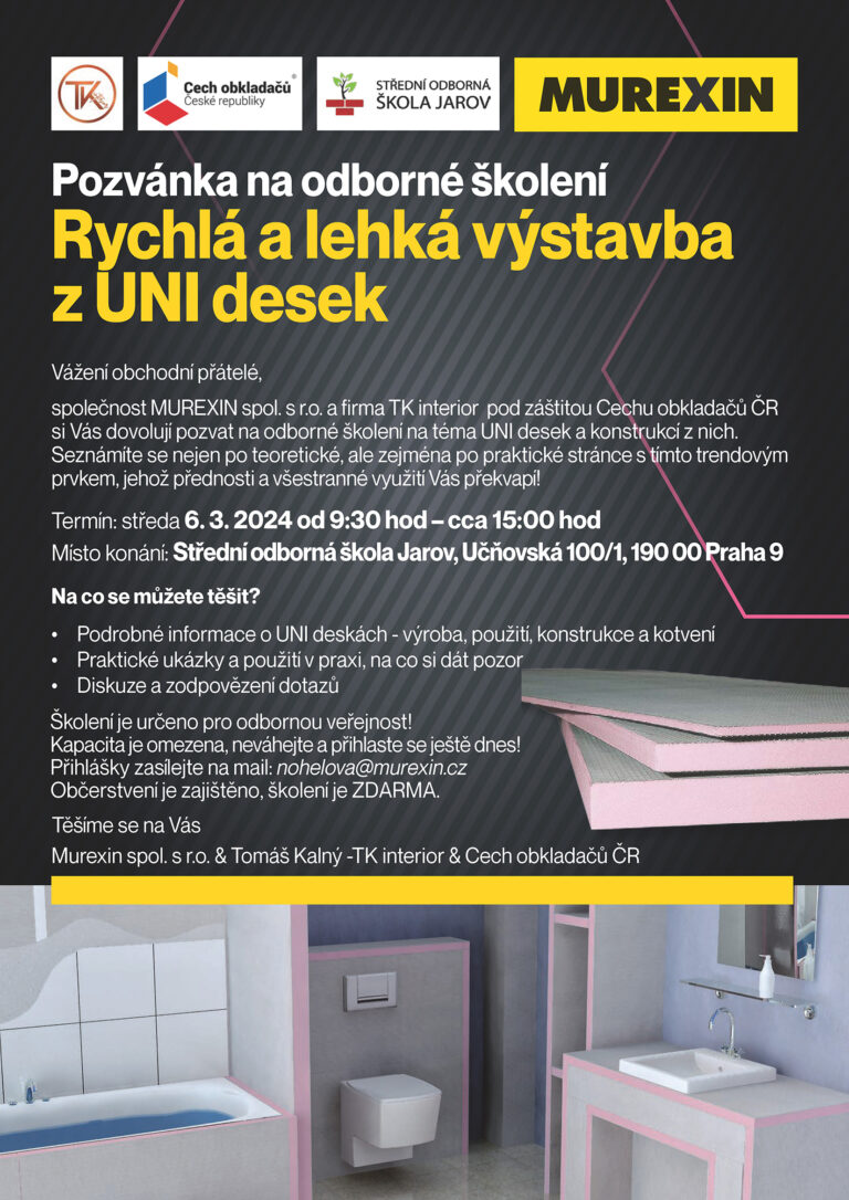MUREXIN – stavební chemie Vás zve na školení ve spolupráci s Cechem obkladačů ČR, členem cechu Tomášem Kalným a Střední odbornou školou Jarov. Výrobek MUREXIN UNI DESKA je stálicí v našem rostimentu, ale právě nyní přicházíme s koncepcí použití pro usnadnění Vaší práce! Přijměte pozvání na zcela unikátní školení na téma UNI DESEK! Školení se koná v Praze!!! Přihlaste se ještě dnes a rezervujte si své místo! MUREXIN. Drží!