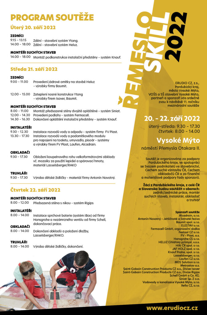 Ve dnech 20. – 22. září 2022 se již pojedenácté sejdou na náměstí ve Vysokém Mýtě učni stavebních oborů, aby si vyzkoušeli, co se již naučili ve svých domovských školách. V důsledku covidu byla během dvou uplynulých let zrušena spousta tradičních přehlídek a soutěží. V současnosti je Řemeslo/Skill největší soutěžní přehlídkou v České republice pro budoucí mistry zedníky, obkladače, montéry suchých staveb, instalatéry a truhláře. O účast v soutěži je letos mimořádný zájem, a proto se zde představí 74 soutěžících z českých a slovenských škol, kteří se budou snažit co nejlépe vypořádat se svými soutěžními úkoly.