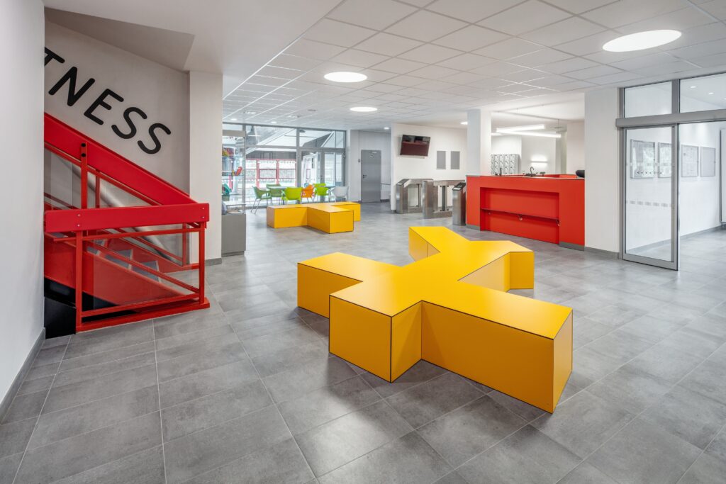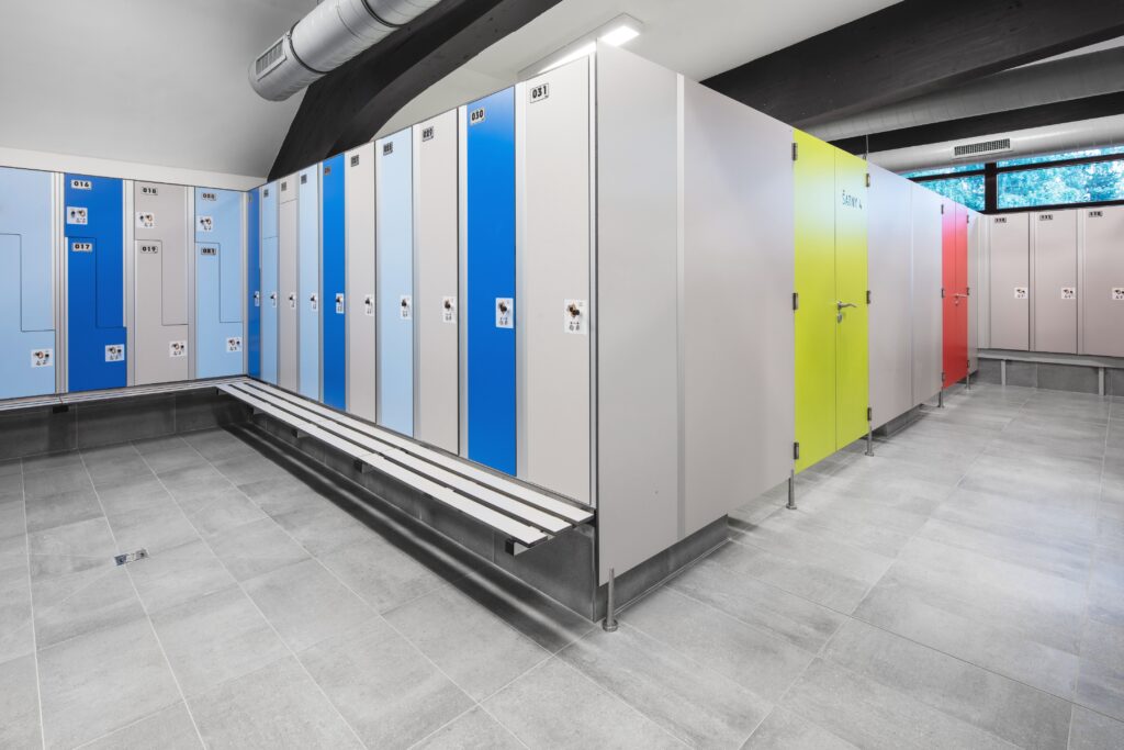Teplá šedá barva tvoří základ interiérů, patřičnou dynamiku vnáší do interiéru výrazné odstíny červené a sytě modré. Ve vstupních prostorách doslova září na šedých dlaždicích žlutá lavice originálního tvaru. Podlaha z dlaždic Cemento nás pak vede dál do šaten, kde neutrální odstín rozsvítily barevné skříňky, dveře a další prvky. Ve sprchách navazují na šedé dlaždice na podlaze šedé obkládačky série Color One.