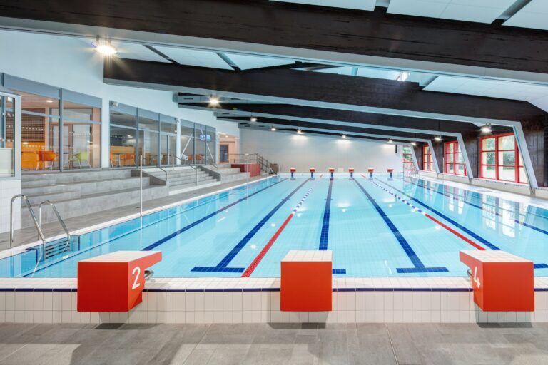 Bazénová hala návštěvníky přivítá otevřeným prostorem, kde šedou doplňují jasně červené a modré prvky. Bezpečnost návštěvníků v okolí bazénu zajišťují dlaždice Cemento s protiskluzným povrchem typu B. Originální pokládka dlaždic v okolí bazénu kombinuje formát 30 x 60 cm ze standardní nabídky značky RAKO s menšími formáty 20 x 60 a 10 x 60 cm, které byly vyrobeny na zakázku. Bazénová vana je obložena keramickými dlaždicemi RAKO OBJECT série Pool, jejíž součástí jsou také speciální bazénové tvarovky.