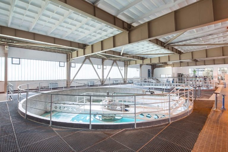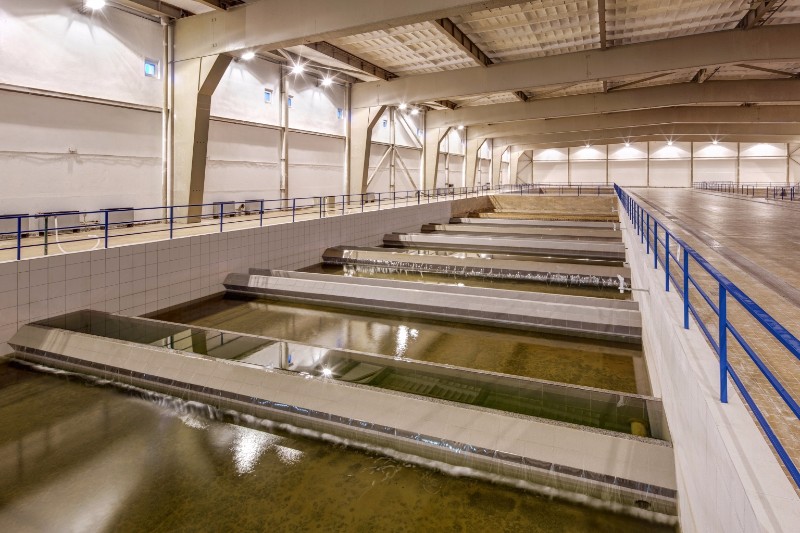 Pět železobetonových GAU filtrů, každý o ploše 69 m2, je vybaveno nerezovými přítokovými a odtokovými žlaby. Filtrační vrstva uhlí činí v každém filtru 205 cm. Filtry se skrývají v prostoru, který je shora částečně zastřešen a částečně kryt podlahou haly nad filtry.