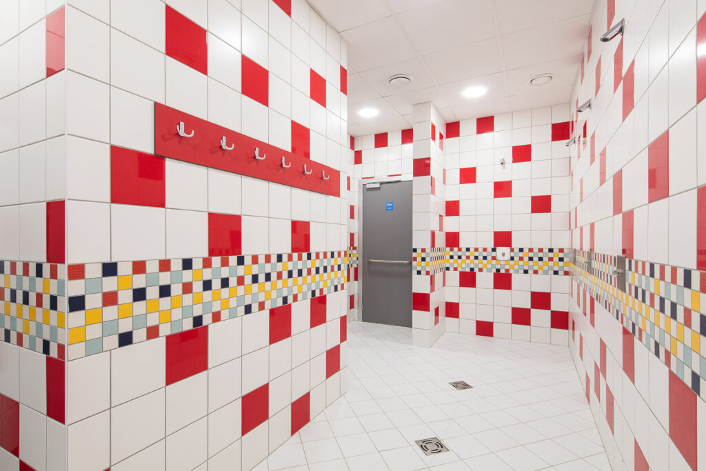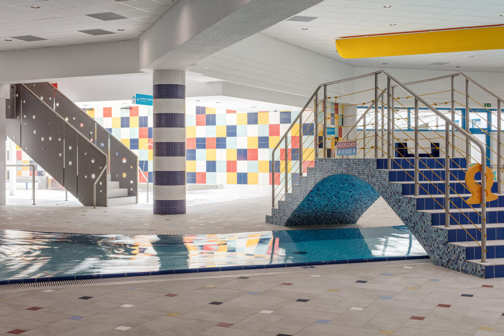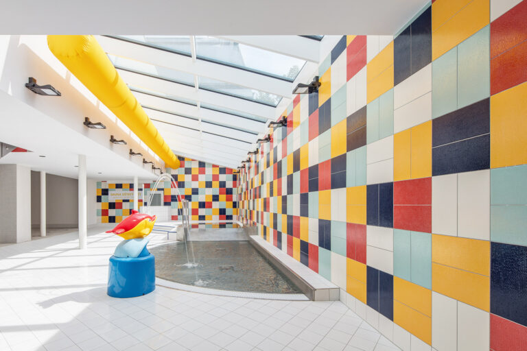 Stěny v zázemí spojuje jednotná linka – pruh keramické mozaiky RAKO. „Doslova jsme oběhli všechny stěny mozaikou kombinující odstíny bílé, tyrkysové, tmavě modré, červené a žluto-oranžové,“ dodává Ing. arch. Zdeněk Šťastný. Bazénové tvarovky pro brouzdaliště v Dětském světě jsou ze série Pool.